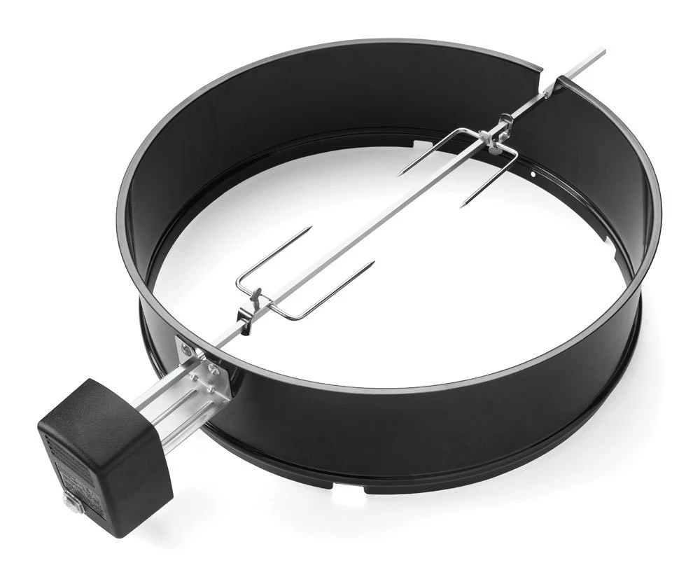 Met elektrische motor (220 V-aansluiting) voor een gelijkmatige rotatie van het eten. Geschikt voor houtskoolbarbecues met een diameter van 57 cm.