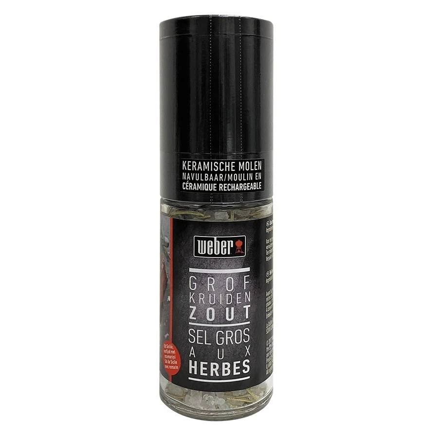 Grof kruidenzout van Weber in een handige kruidenmolen. De keramische kruidenmolen is instelbaar en navulbaar.