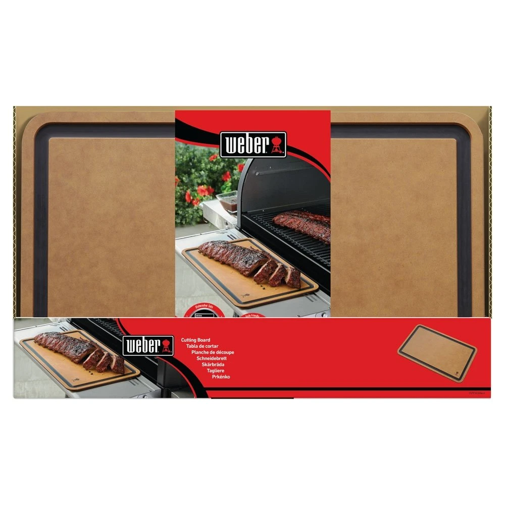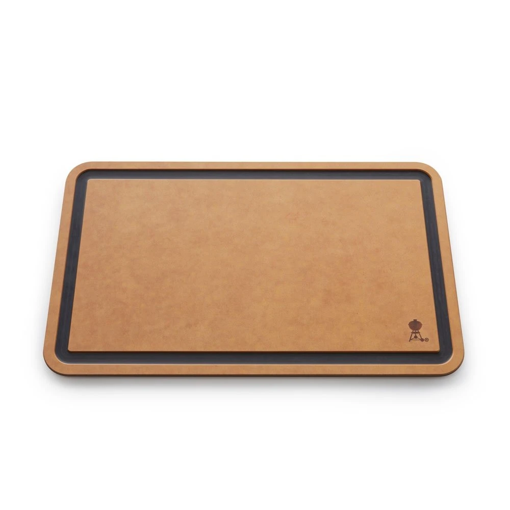 Universele snijplank. Vaatwasmachinebestendig. Gootjes voor sappen. Past in Weber® SmokeFire zijtafel (7001): rails onder tafel om de snijplank in te schuiven. Paper Wood – goedgekeurd voor bereiding voor voedsel.
